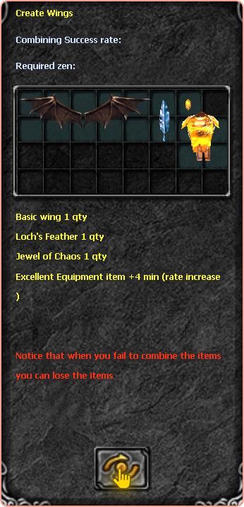 Now, with the Chaos weapon in hand, you can create your level 1 wing. For the combination of the wing, you will need the following ingredients below: