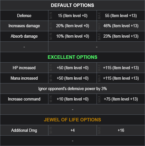 | Wings of Dragon for BK | Wings of Soul for SM | Wings of Spirits for ME | Wings of Darkness for MG | Cape of Lord for DL |