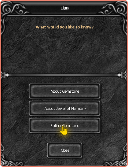 Khi bắt đầu cuộc trò chuyện với NPC Elpis, hộp thoại sẽ xuất hiện, nhấp vào lựa chọn thứ ba có tên là LÀM TINH LUYỆN NGỌC QUÝ. Xem ví dụ dưới đây chỉ ra nơi bạn nên nhấp: