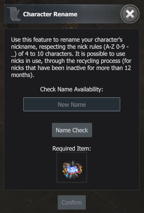 Để thực hiện thay đổi này, điều cần thiết là bạn phải sở hữu vật phẩm có tên Đổi tên nhân vật trong vé, vật phẩm này trở thành bắt buộc đối với mỗi thay đổi được thực hiện.