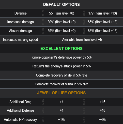 Dưới đây là danh sách các tùy chọn bổ sung cho mỗi Wings và giá trị của chúng cho từng cấp độ mặt hàng từ +0 đến +13.