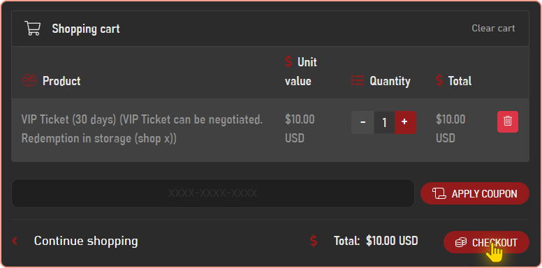 Now you can choose the quantity of items and apply discount coupons (if available). After that, you can proceed to payment by clicking on the CHECKOUT button. See the example below indicating where you should click: